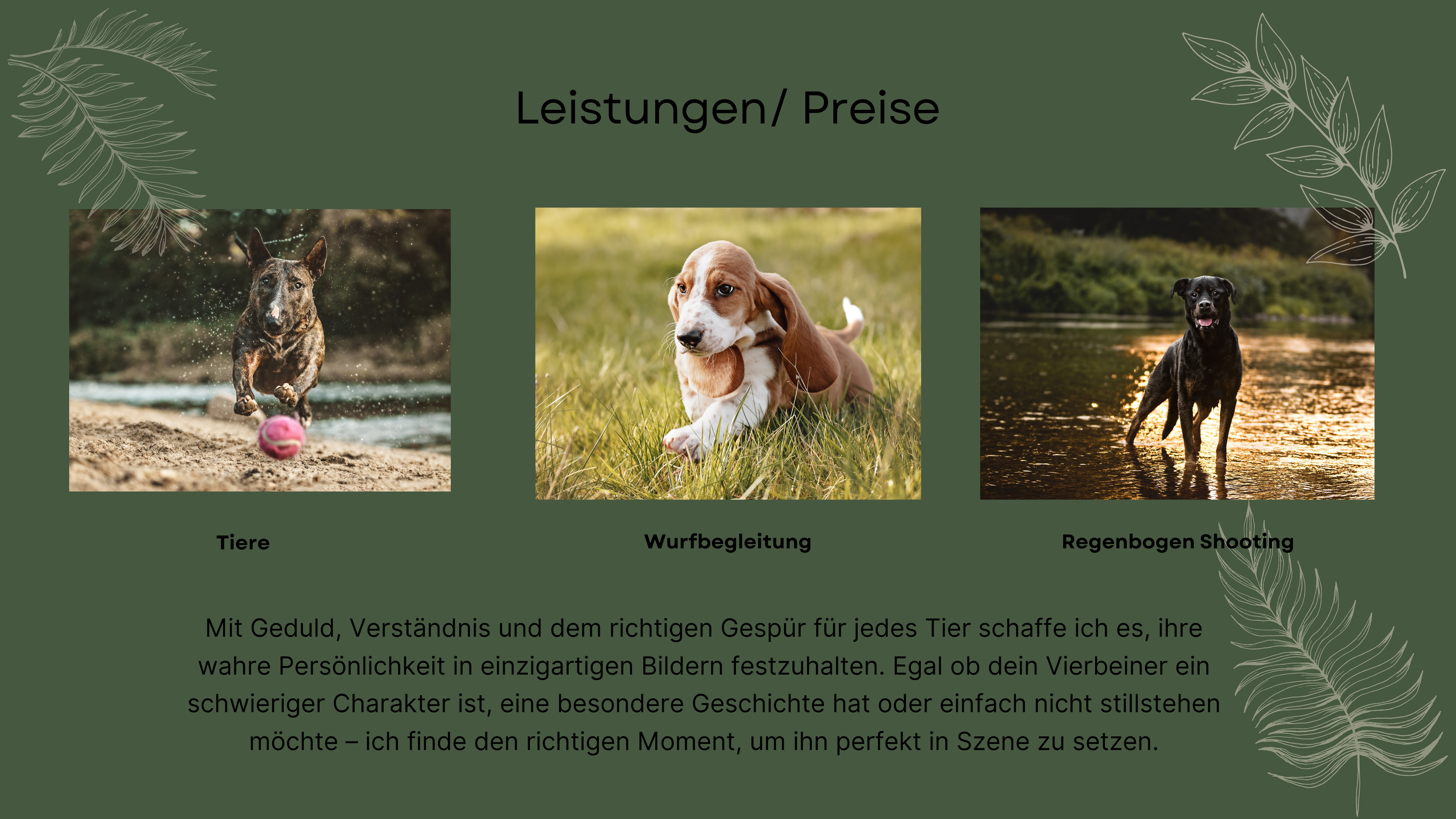 Mit Geduld, Verständnis und dem rDu siehst hier keine offenen Preise? Das hat einen ganz besonderen Grund! Mir ist es wichtig, zuerst ein paar Worte mit dir zu wechseln – egal, ob per E-Mail, WhatsApp oder in einem Telefonat. Du entscheidest, wie du dich am wohlsten fühlst. So können wir uns ein bisschen kennenlernen – und vor allem kannst du ein Gefühl dafür bekommen, wer ich bin. Wir werden gemeinsam eine wundervolle und intensive Zeit erleben, voller Emotionen und einzigartiger Momente. Deshalb finde ich es schön, wenn du von Anfang an weißt, mit wem du deine wertvolle Zeit teilst. Natürlich schicke ich dir meine Preispakete sehr gerne zu. Damit du schon mal einen Eindruck bekommst: Ein Shooting bei mir startet ab 150 €. Die meisten meiner Kunden investieren im Schnitt zwischen 300 € und 750 €, um ihre besonderen Erinnerungen festzuhalten. Ich freue mich schon sehr darauf, von dir zu hören und gemeinsam etwas Einzigartiges zu schaffen!ichtigen Gespür für jedes Tier schaffe ich es, ihre wahre Persönlichkeit in einzigartigen Bildern festzuhalten. Egal ob dein Vierbeiner ein schwieriger Charakter ist, eine besondere Geschichte hat oder einfach nicht stillstehen möchte – ich finde den richtigen Moment, um ihn perfekt in Szene zu setzen.
