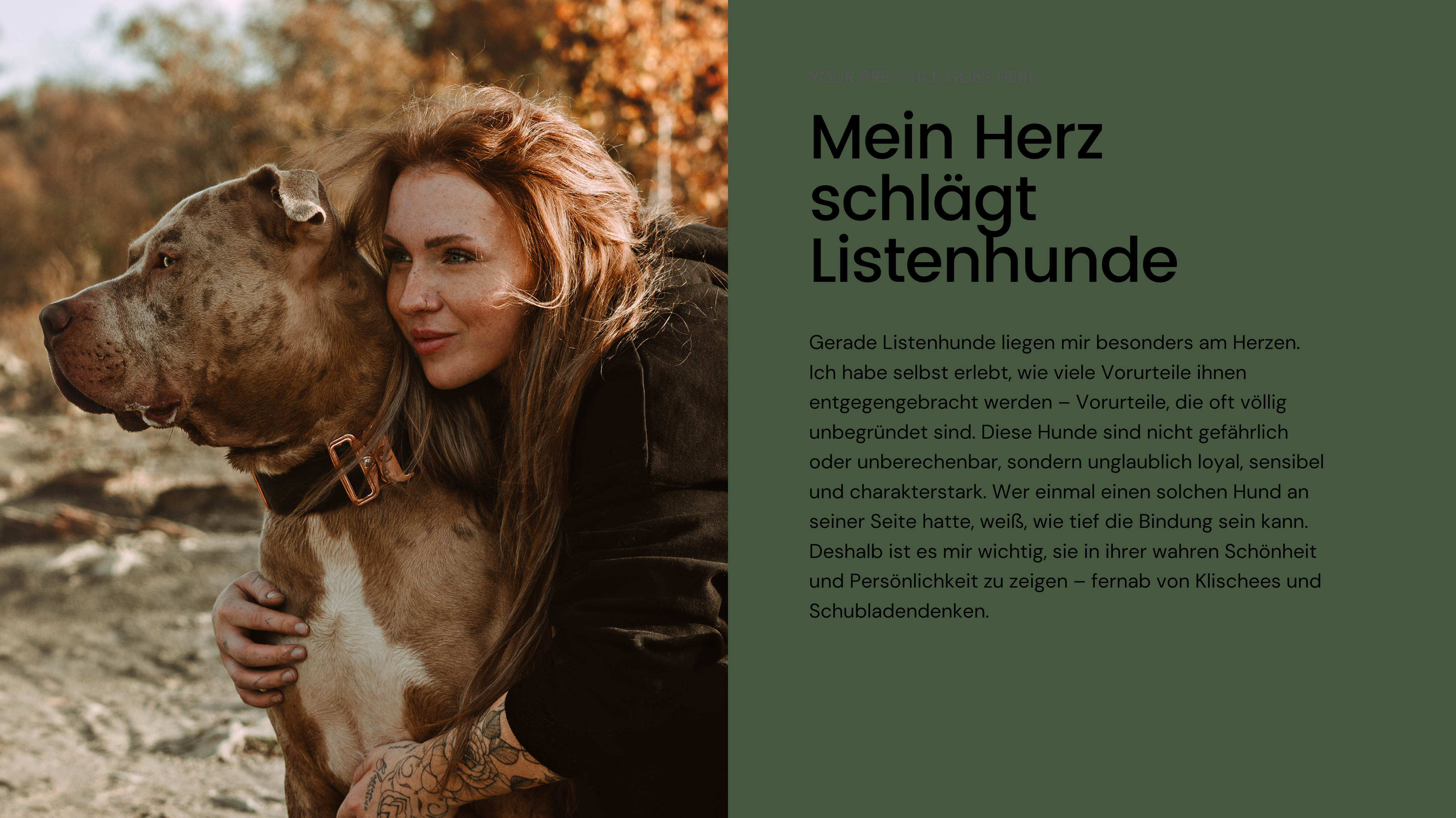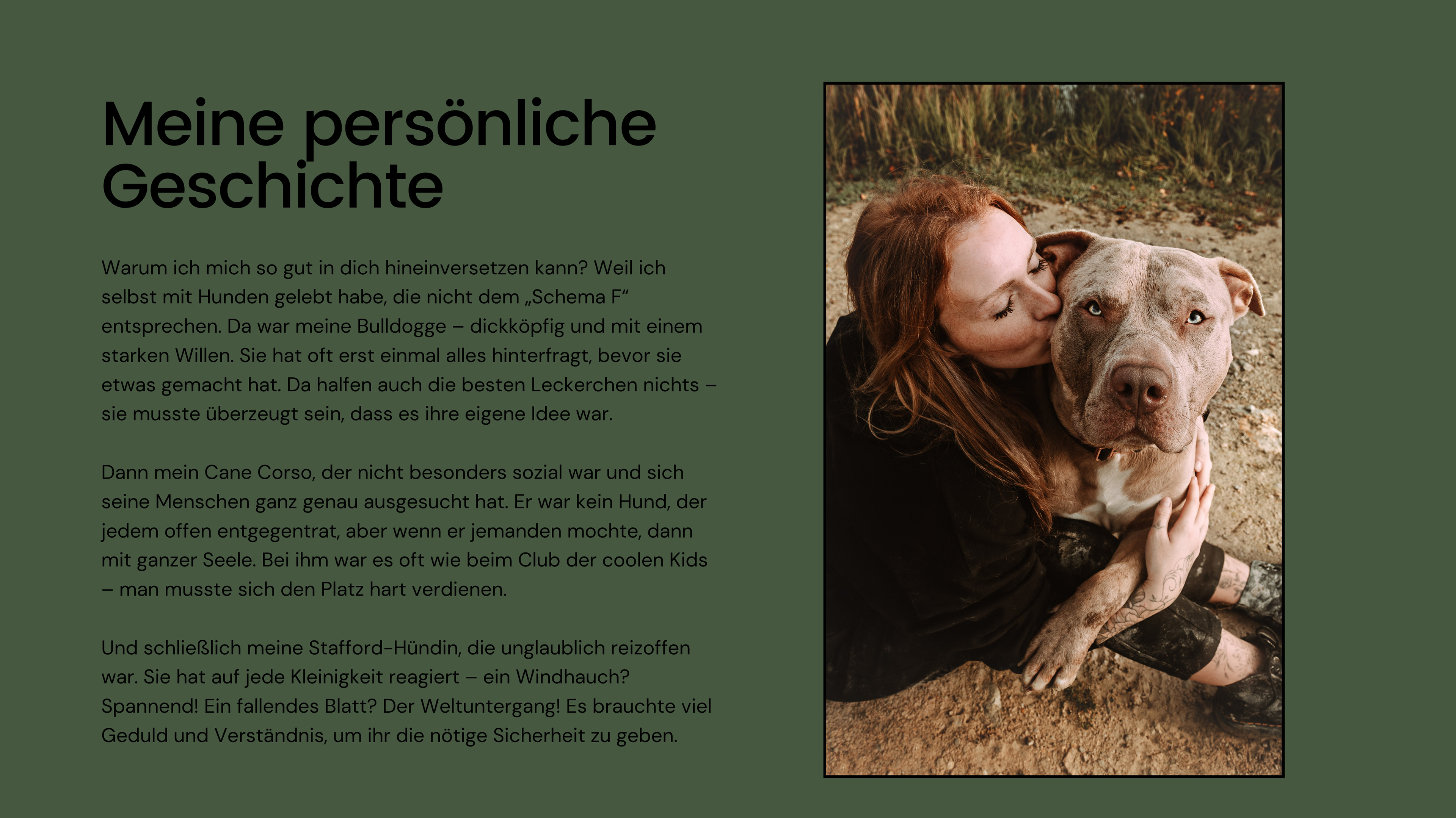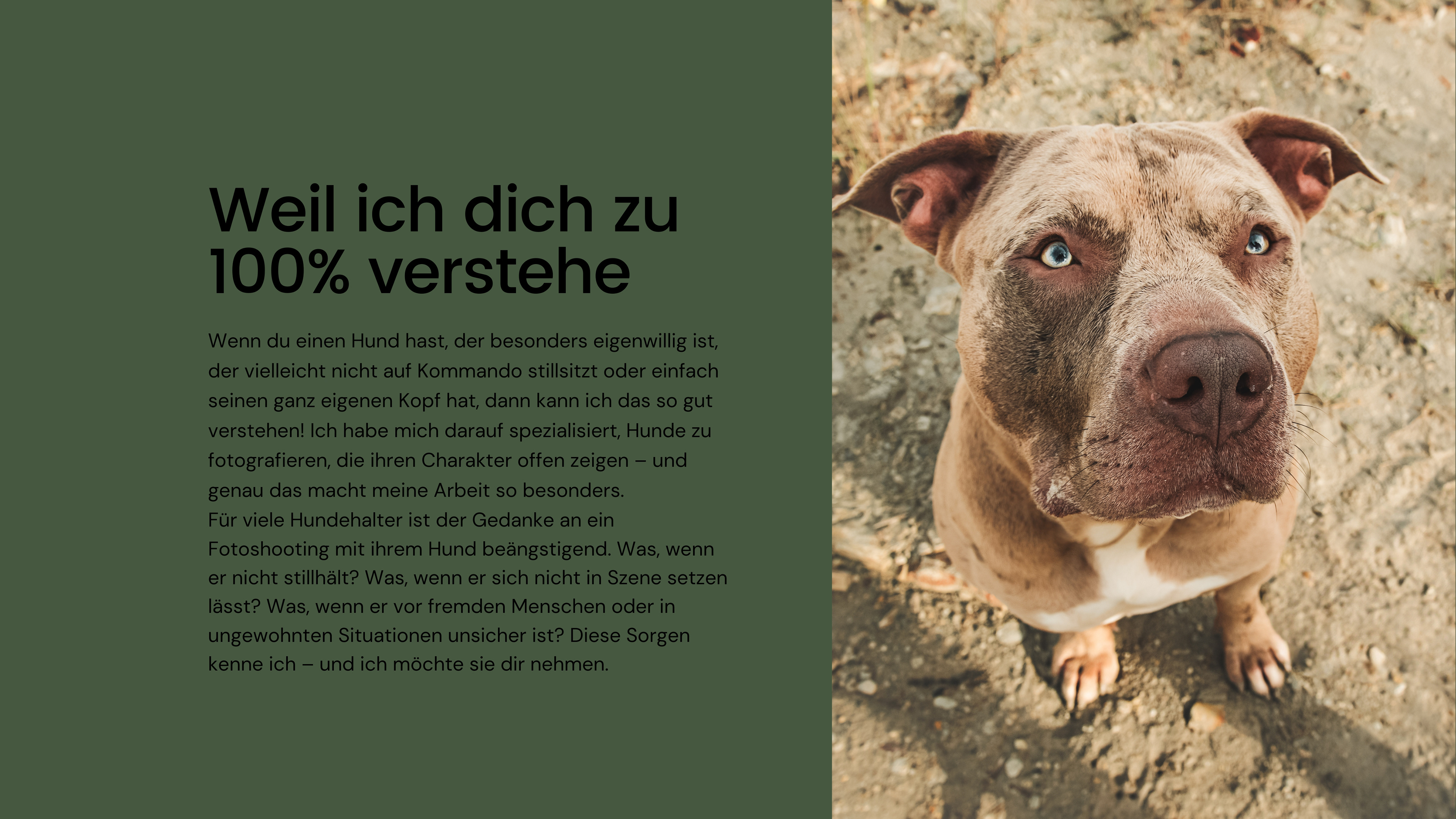Warum ich nur charakterstarke Hunde fotografiere  Wenn du einen Hund hast, der besonders eigenwillig ist, der vielleicht nicht auf Kommando stillsitzt oder einfach seinen ganz eigenen Kopf hat, dann kann ich das so gut verstehen! Ich habe mich darauf spezialisiert, Hunde zu fotografieren, die ihren Charakter offen zeigen – und genau das macht meine Arbeit so besonders.  Für viele Hundehalter ist der Gedanke an ein Fotoshooting mit ihrem Hund beängstigend. Was, wenn er nicht stillhält? Was, wenn er sich nicht in Szene setzen lässt? Was, wenn er vor fremden Menschen oder in ungewohnten Situationen unsicher ist? Diese Sorgen kenne ich – und ich möchte sie dir nehmen.  Meine Erfahrung als Tierfotografin hat mir gezeigt, dass gerade die Hunde mit dem größten Charakter oft die schönsten, authentischsten Bilder entstehen lassen. Mir geht es nicht darum, dass dein Hund perfekt „funktioniert“. Ich möchte seinen wahren Kern einfangen: Das freche Funkeln in seinen Augen, die neugierige Schnüffelnase oder die wilde Freude, wenn er sich einfach auslebt.  Warum ich mich so gut in dich hineinversetzen kann? Weil ich selbst mit Hunden gelebt habe, die nicht dem „Schema F“ entsprechen. Da war meine Bulldogge – dickköpfig und mit einem starken Willen. Sie hat oft erst einmal alles hinterfragt, bevor sie etwas gemacht hat. Da halfen auch die besten Leckerchen nichts – sie musste überzeugt sein, dass es ihre eigene Idee war.  Dann mein Cane Corso, der nicht besonders sozial war und sich seine Menschen ganz genau ausgesucht hat. Er war kein Hund, der jedem offen entgegentrat, aber wenn er jemanden mochte, dann mit ganzer Seele. Bei ihm war es oft wie beim Club der coolen Kids – man musste sich den Platz hart verdienen.  Und schließlich meine Stafford-Hündin, die unglaublich reizoffen war. Sie hat auf jede Kleinigkeit reagiert – ein Windhauch? Spannend! Ein fallendes Blatt? Der Weltuntergang! Es brauchte viel Geduld und Verständnis, um ihr die nötige Sicherheit zu geben.  Gerade Listenhunde liegen mir besonders am Herzen. Ich habe selbst erlebt, wie viele Vorurteile ihnen entgegengebracht werden – Vorurteile, die oft völlig unbegründet sind. Diese Hunde sind nicht gefährlich oder unberechenbar, sondern unglaublich loyal, sensibel und charakterstark. Wer einmal einen solchen Hund an seiner Seite hatte, weiß, wie tief die Bindung sein kann. Deshalb ist es mir wichtig, sie in ihrer wahren Schönheit und Persönlichkeit zu zeigen – fernab von Klischees und Schubladendenken.  Diese Erfahrungen haben mich geprägt. Ich weiß, wie es ist, wenn dein Hund nicht der ist, der sich problemlos in jede Situation fügt. Und genau deshalb kann ich dir beim Fotoshooting das Gefühl geben, verstanden zu werden. Mir ist wichtig, dass du und dein Hund euch wohlfühlt. Deshalb nehme ich mir viel Zeit, um eine entspannte Atmosphäre zu schaffen. Wir lassen alles in Ruhe angehen, ohne Druck. Dein Hund darf so sein, wie er ist – ob quirlig, schüchtern, wild oder sanft.  Denn genau darin liegt die Magie. In den Momenten, die dein Hund ganz ungestellt schenkt. Wenn er lacht, tobt oder einfach nur mit großen Augen in die Kamera schaut. Diese echten Momente halte ich fest. Für dich. Für immer.  Wenn du also denkst, dein Hund sei „zu wild“, „zu eigen“ oder „zu schüchtern“ für ein Fotoshooting – dann lass uns das Gegenteil beweisen. Ich freue mich darauf, deinen charakterstarken Hund kennenzulernen und seine Geschichte in Bildern zu erzählen!